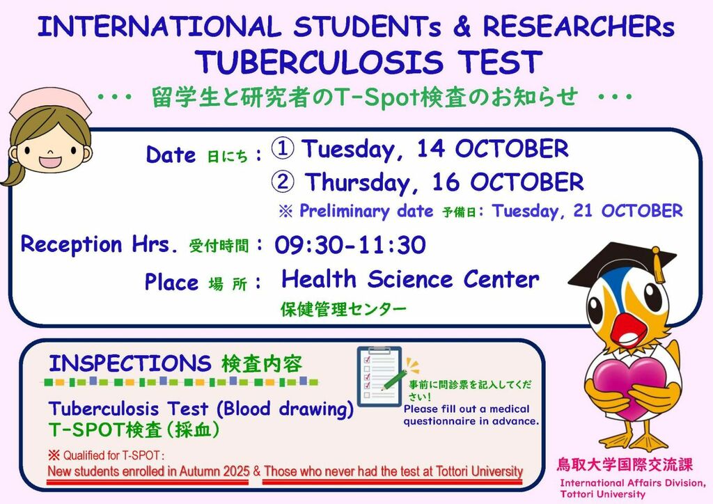 The Tuberculosis test for international students and researchers from overseas will be held below. Those who will be contacted by email must be taken. In addition, JICA students should have a medical checkup as well.
