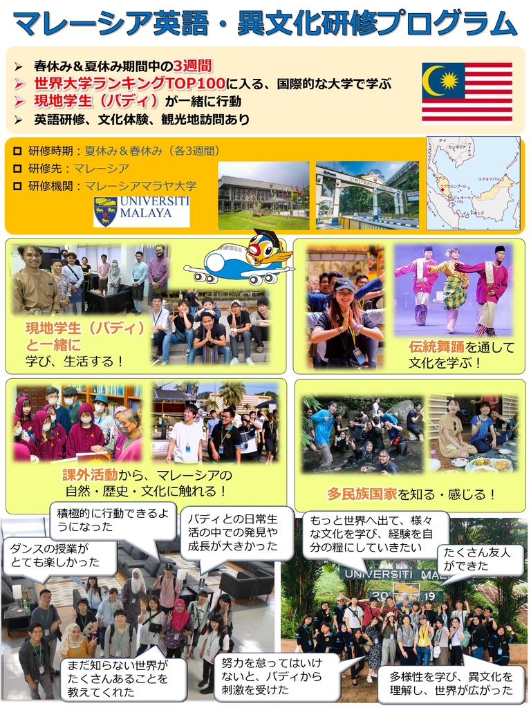 初めて海外に出る、いわゆる留学の初心者も参加できるプログラムです。元英植民地の多民族社会であるマレーシアでの研修では多民族社会の中の宗教、文化、言語の環境を経験することができます。また、マラヤ大学はマレーシアではトップ、世界ランキング70(QS World University Rankings 2023)の大学で、将来の専門・研究留学先としても考えられます。主催の社会人文学部では、語学、見学のほかに、特に伝統音楽と舞踊の体験に力を入れています。