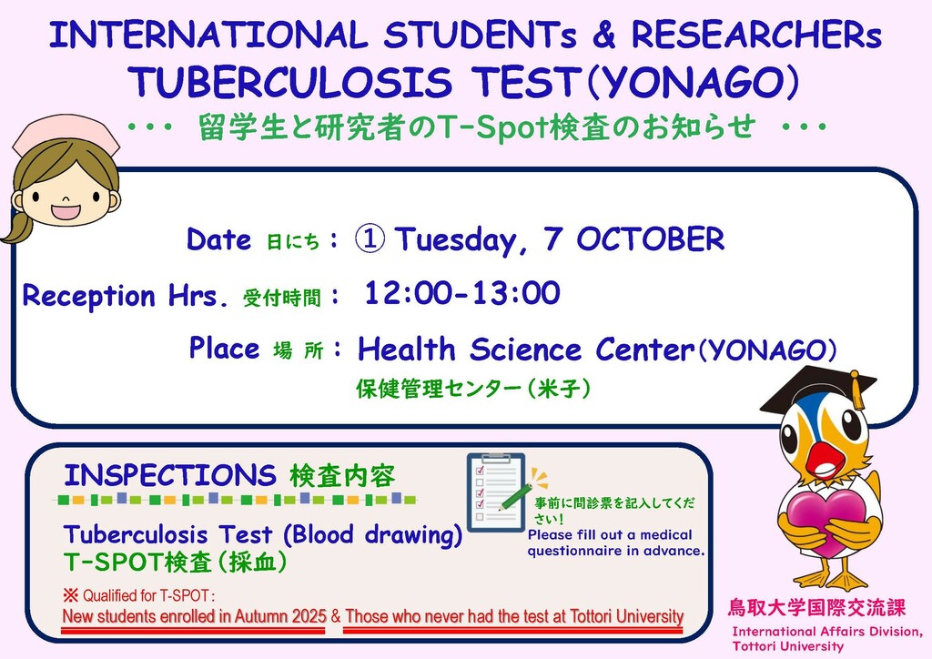 米子キャンパスの外国人留学生のためのT-Spot検査を実施します。 対象者にはメールで連絡しますので、必ず受診してください。