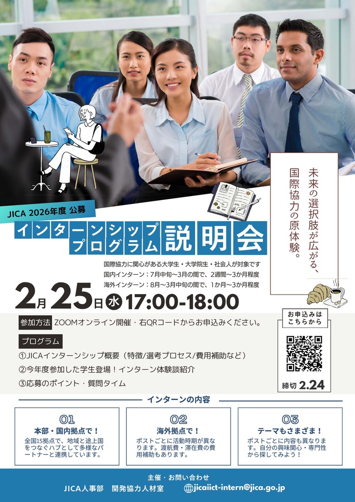 詳 細:2026年度JICA公募インターンシップ・プログラム説明会 | ニュース・広報 - JICA