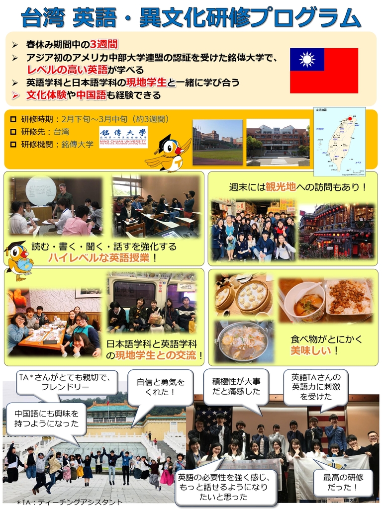 台湾の銘傳(めいでん)大学で鳥取大学のために実施する英語研修プログラムで、英語の実践的運用能力を磨きます。米・英・カナダで学んだ素晴らしい教授陣による、英語4技能(読む・書く・聞く・話す)の集中トレーニングで、授業はすべて英語で行われます。授業以外にCultural Tourにも参加し、台湾の歴史・文化に触れることができます。銘傳大学の英語・日本語専攻の学生がTA(ティーチングアシスタント)として参加してくれるので、安心して参加でき、学生同士の交流も図れます。