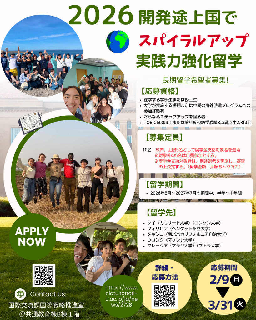 鳥取大学は、長期留学プログラム「開発途上国でスパイラルアップ実践力強化留学」の派遣学生を募集します。