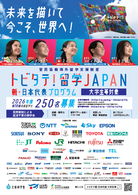文部科学省、独立行政法人日本学生支援機構では、意欲と能力のある全ての日本の若者が、海外留学に自ら一歩を踏み出す機運を醸成することを目的として、2013年度から「トビタテ!留学JAPAN」を推進しています。