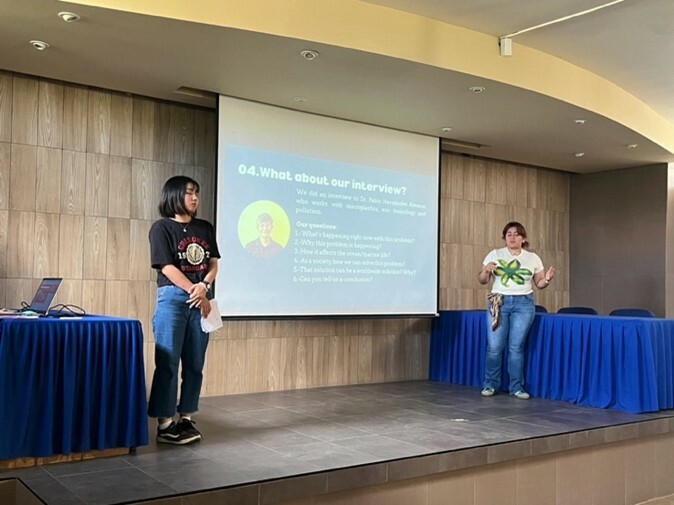 最終プレゼンテーションでは、多くの人の前で発表を行いました。各日本人学生とUABCSの学生がペアとなり、ラパスでどのようなことが課題となっているのかを話し合い、そこからテーマを決めて私たちにできる身近な解決策を考えました。準備期間はわずか7日という短い時間でしたが、その中で街頭インタビューや学生へのアンケート調査を行い、詳細な数値化された情報を集めました。また、インターネットや図書館の資料を活用しながら下調べを進め、より説得力のある発表にするよう努めました。短い時間の中でみんな四苦八苦しながら取り組みましたが、UABCSの学生は分からない点を一から丁寧に教えてくれたため、無事に発表を終えることができました。この過程を通じて協力し合う大切さを学び、さらにメキシコ人学生との距離が近づいたと感じています。最終プレゼンテーションの前と後では一人一人が成長し、堂々と発表する姿を見ることができ、とても貴重な体験だったと思います。私は人の前で発表することがとても苦手でしたが、ペアのUABCSの学生がたくさんの励ましの言葉をくれて緊張することなく発表出来ました。とても感謝しています。