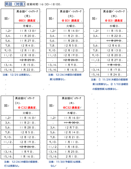 2025年11月4日の週~2026年1月までの期間(11/25~27の間はテスト期間のため開講しない)